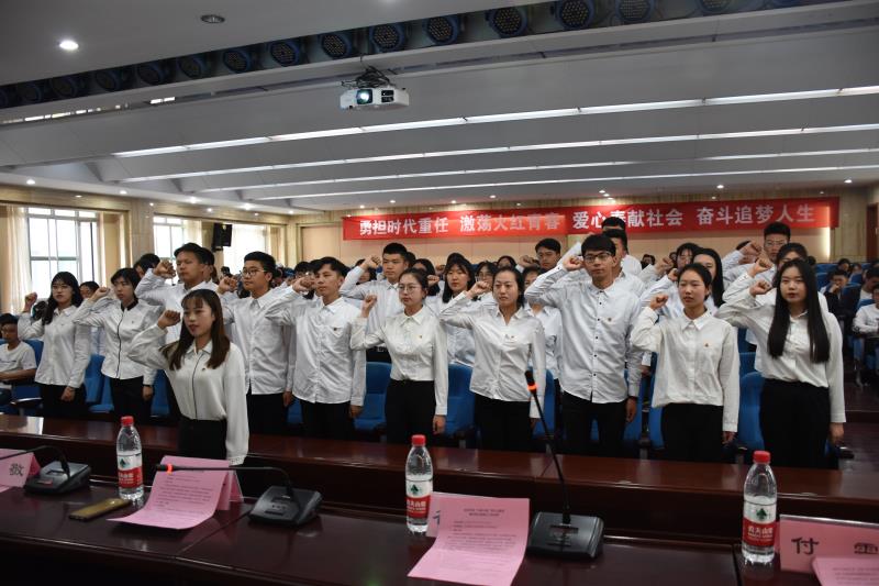经济学院“关爱小屋”青年志愿者临时团支部全体团员起立,面向团旗重温入团誓词�