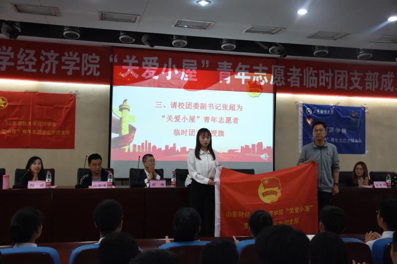 王琦宣布经济学院“关爱小屋”青年志愿者临时团支部的组织构成,谷学峰宣读校团委《关于同意成立经济学院“关爱小屋”青年志愿者临时团支部的批复》,张超为“关爱小屋”青年志愿者临时团支部授旗,临时团支部团员代表李昕同学发言�