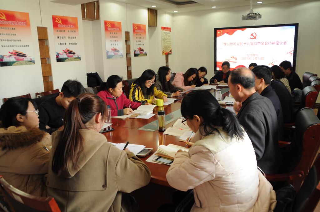(通讯员:李冰封王佳敏孙俏俏)2019�12�18日下午,经济学院在舜耕校区办公楼1208召开学习贯彻党的十九届四中全会精神座谈会。经济学院党委书记姜伟,院长董长瑞,党委副书记高峰,支部书记代表、辅导员代表、教授代表、民主党派代表、青年教师代表、学生党团员代表出席座谈会。会议由姜伟主持�