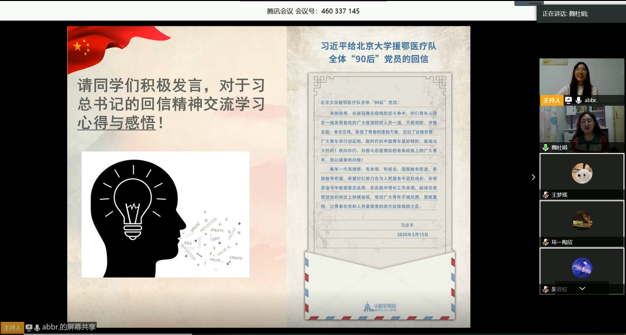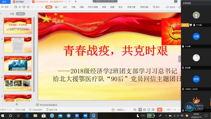 (通讯员:徐清� 常群)为深入学习贯彻习近平总书记给北京大学援鄂医疗队�90后”党员回信精神,广泛发动团员青年向在疫情防控一线担当奉献的青年学习,按照校团委有关要求,结合学院实际,3�18日至23日,经济学院各团支部依托网络平台开展学习习总书记给北京大学援鄂医疗队�90后”党员回信线上主题团日活动�