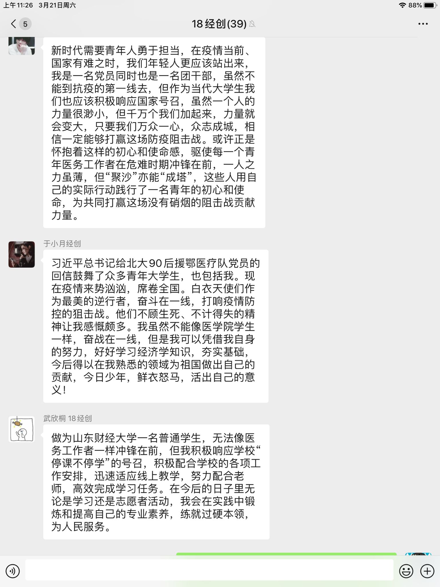 各团支部以“青春战疫,共克时艰”“青春抗疫,从我做起”“致敬抗疫英雄,让青春在战‘疫’中闪光”“众志成城同抗疫,青春聚力勇担当”“凝聚青春正能量,同心抗疫担使命”“致敬逆行者,共筑青春抗疫长城”等为主题,形式新颖,内容丰富多彩:带领团员青年认真学习领会习近平总书记此次回信精神,号召广大团员青年争做不惧风雨、勇挑重担的新时代青年;观看各行各业抗疫英雄的事迹视频、组织线上诗朗诵、分享身边的抗疫英雄事迹;手绘祝福语、录制短视频、线上同唱一首红歌,为武汉加油,为中国加油。各团支部还组织团员在团支部微信群、朋友圈等交流分享学习心得,广大青年纷纷表示将积极向抗疫英雄学习其家国情怀、担当精神、仁心大爱和奉献品德,努力将学习成果转化为勇于担当、甘于奉献、勤于进取的行动�