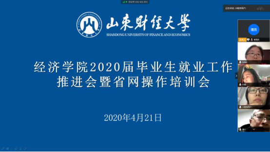 (通讯员:裴斐�4�21日晚上,学院利用腾讯会议平台召开2020届毕业生就业工作推进会暨省网操作培训会。经济学院党委副书记高峰,就业办主任裴斐,毕业班辅导员周新秀、李冰封、付雯和全体毕业生班长团支书参加会议。会议由付雯主持�