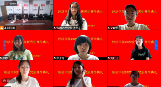 2020�9�4日上午,经济学院2020级研究生开学典礼采用线上方式成功举行。经济学院党委书记姜伟、院长董长瑞、党委副书记仵颖涛、副院长彭留英、教师代表白洁副教授、学工办主任周新秀、研究生秘书刘应涛出席了开学典礼,开学典礼由周新秀主持�