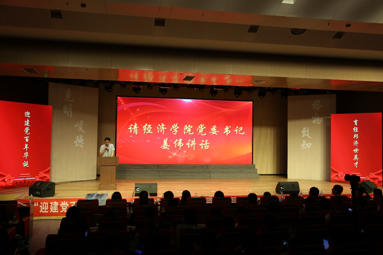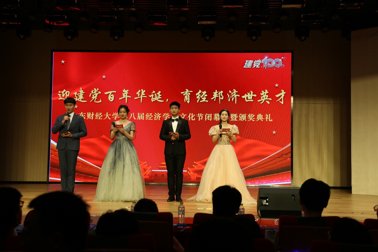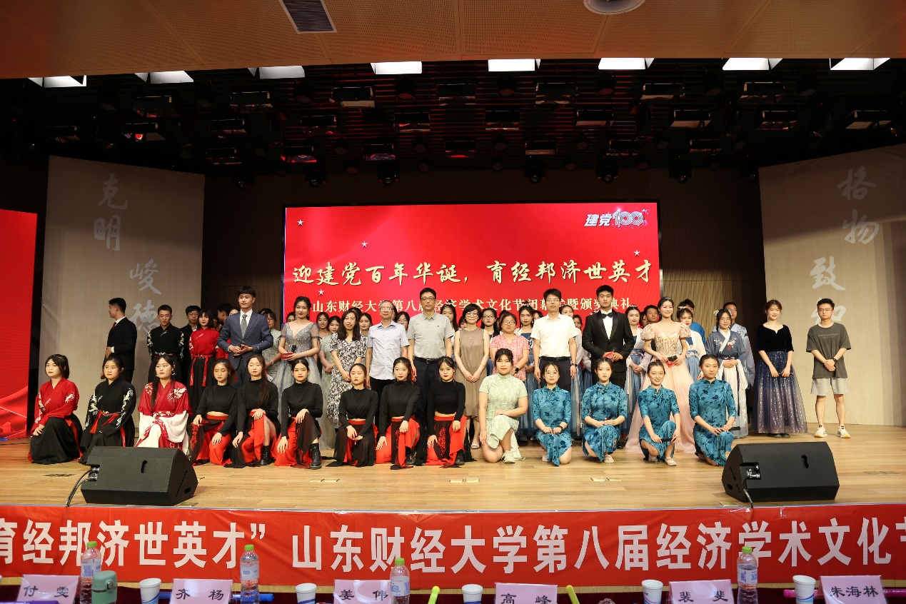(通讯员:王涵 王嘉� 韩云� 冯源�6�9日晚,由校学生工作处、校团委、经济学院主办,经济学院团委、学生会承办的“迎建党百年华诞,育经邦济世英才”山东财经大学第八届经济学术文化节闭幕式暨颁奖典礼于圣井校区文化活动中心举行。经济学院党委书记姜伟、副书记高峰、副院长齐杨、学工办主任裴斐、团委书记付雯、就业办主任朱海林出席会议。获奖学生代表、经济学�2019�2020级学生到场参加�