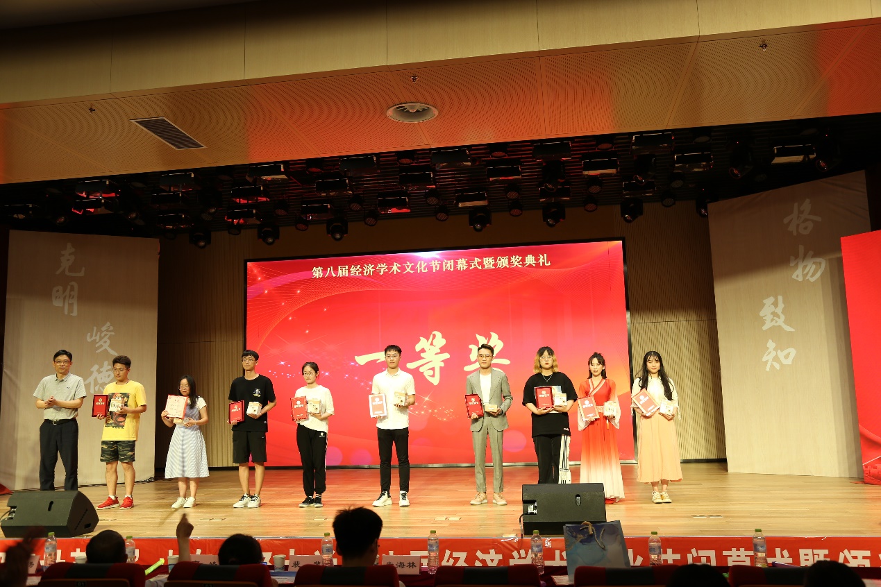 闭幕式开始,主持人带着观众以视频播放的形式,回顾本届经济学术文化节各项活动精彩片段,随后高峰宣读获奖名单,各位领导老师为获奖同学颁奖,获奖学生代表2019级经济学3班郭硕同学发言�