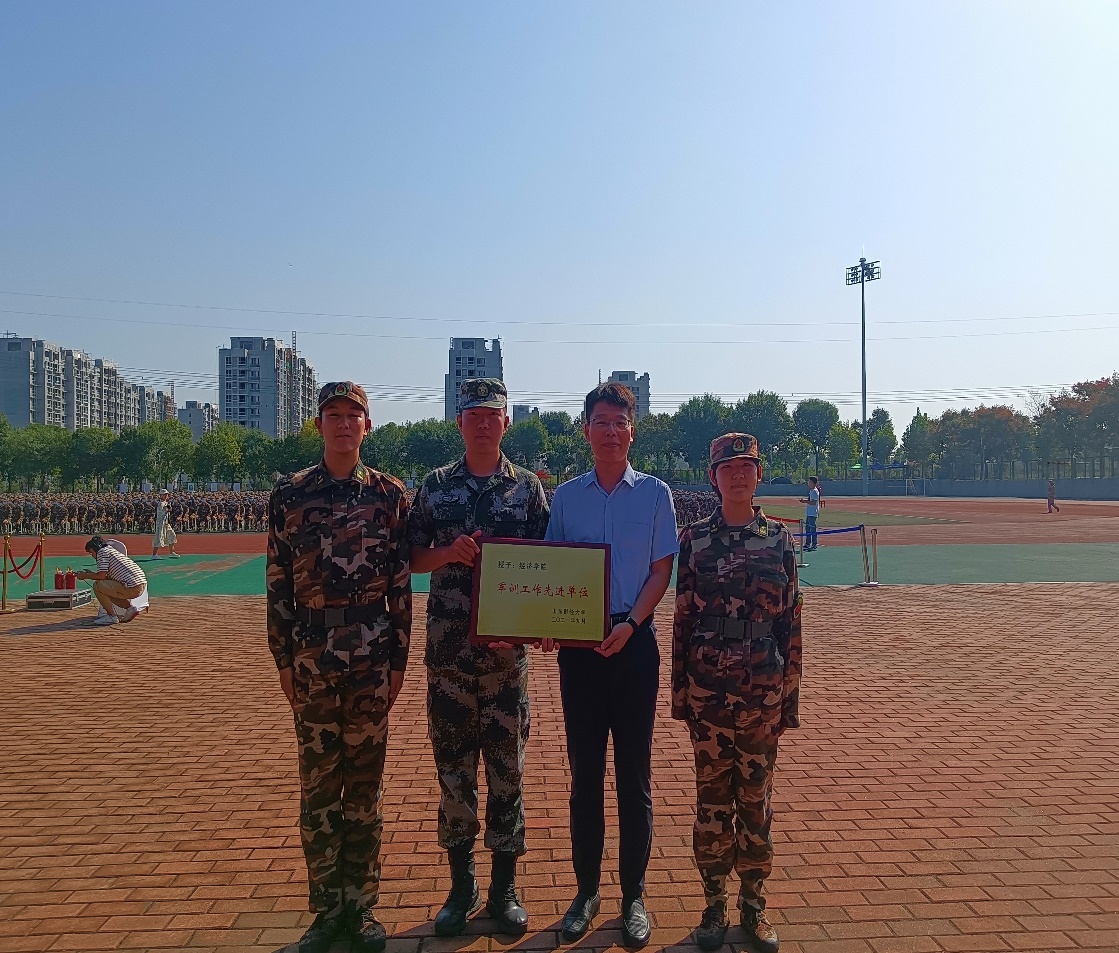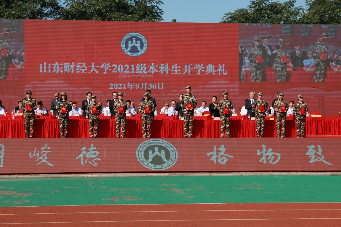 9�29日上午,山东财经大学2021级新生开学典礼在圣井校区隆重举行。军训团政委、校党委学生工作部、学生工作处处长王剑宣读了《关于表�2021年国防教育先进集体、优秀军训学生、优秀教官的决定》。经济学院被评为“军训工作先进单位”,朱海林被评为“国防教育先进工作者”,矫宇航、颜瑜凡被评为“优秀志愿者”,王泽栋等26名同学被评为“优秀军训学生”�