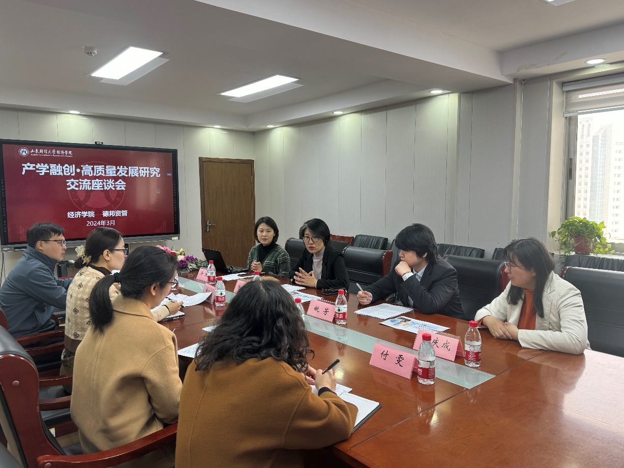 (通讯员:付雯�3�28日,经济学院在舜耕校区办公楼会议室与德邦证券资产管理有限公司举办产学融创·高质量发展研究交流座谈会。德邦资管总经理徐盼盼、德邦证券财富支持中心投教负责人姚芳、德邦资管销售部高级合规经理徐晨、德邦证券数智支持中心投保经理吴庆成、经济学院党委副书记李冰封,副院长崔宝敏、张明志、团委书记付雯参加座谈�