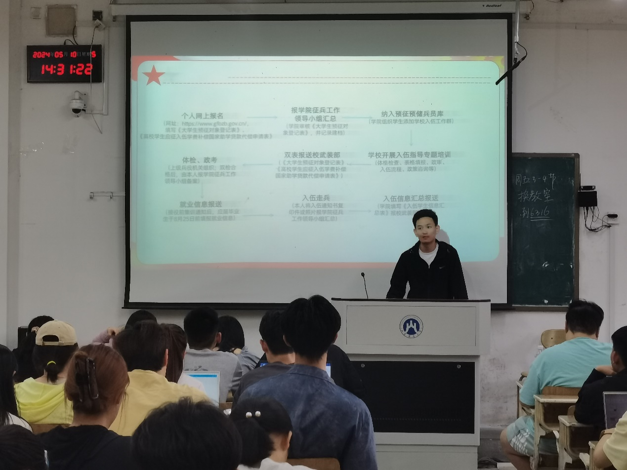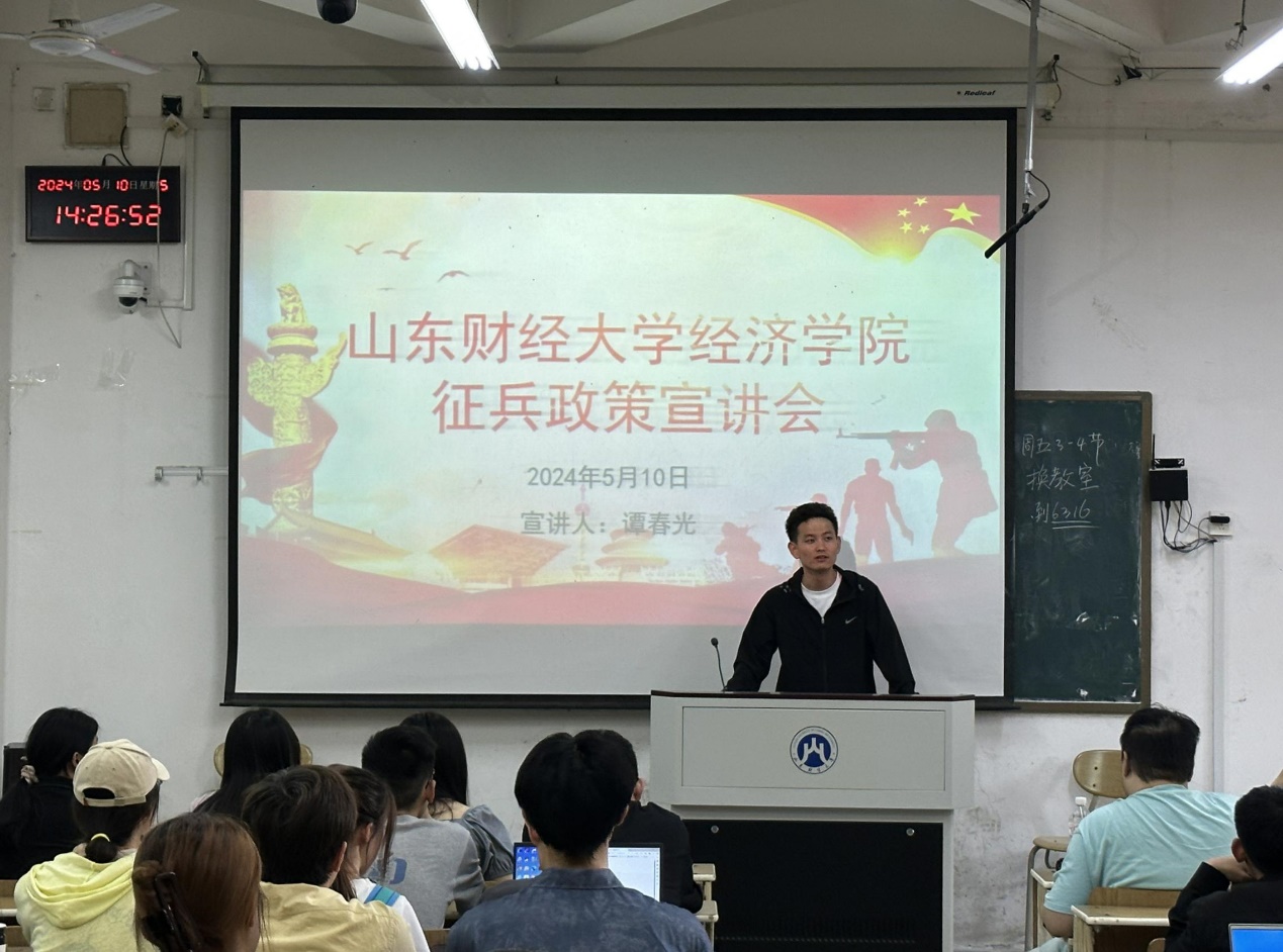 (通讯员:矫宇� 叶雨涵)携笔从戎心向党,绿色军营写青春,为深入贯彻习近平强军思想,引导和鼓励大学生应征入伍,5�10日下午,经济学院于舜耕校�6号楼举办“有志青� 参军报国”征兵政策宣讲会。宣讲会由经济学院辅导员谭春光主讲,部分2024届毕业生到场参会�