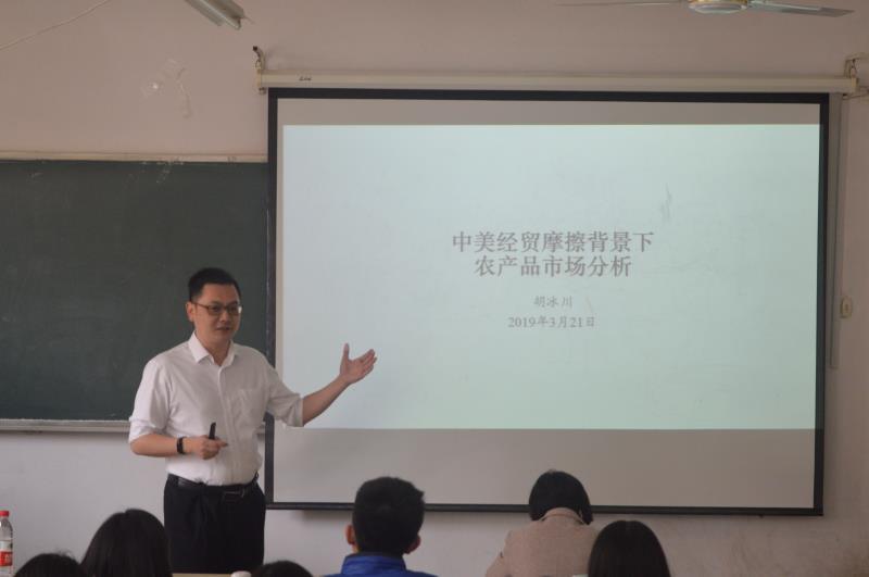 3�21日下午,中国社会科学院农村发展研究所农产品市场与贸易研究室副主任、研究员胡冰川博士应邀来我院做学术交流,并在舜耕校区教学楼作题为“中美经贸摩擦背景下农产品市场分析”的学术报告。报告会由经济学院副院长王传荣教授主持,学院部分师生到场聆听�